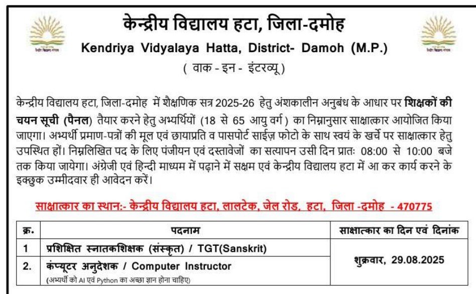 - साक्षात्कार तिथि – मध्यप्रदेश केन्द्रीय विद्यालय शिक्षक भर्ती के लिए साक्षात्कार तिथि 29 अगस्त एवं 09 सितंबर 2025 निर्धारित है जो जिला के अनुसार अलग-अलग हैं