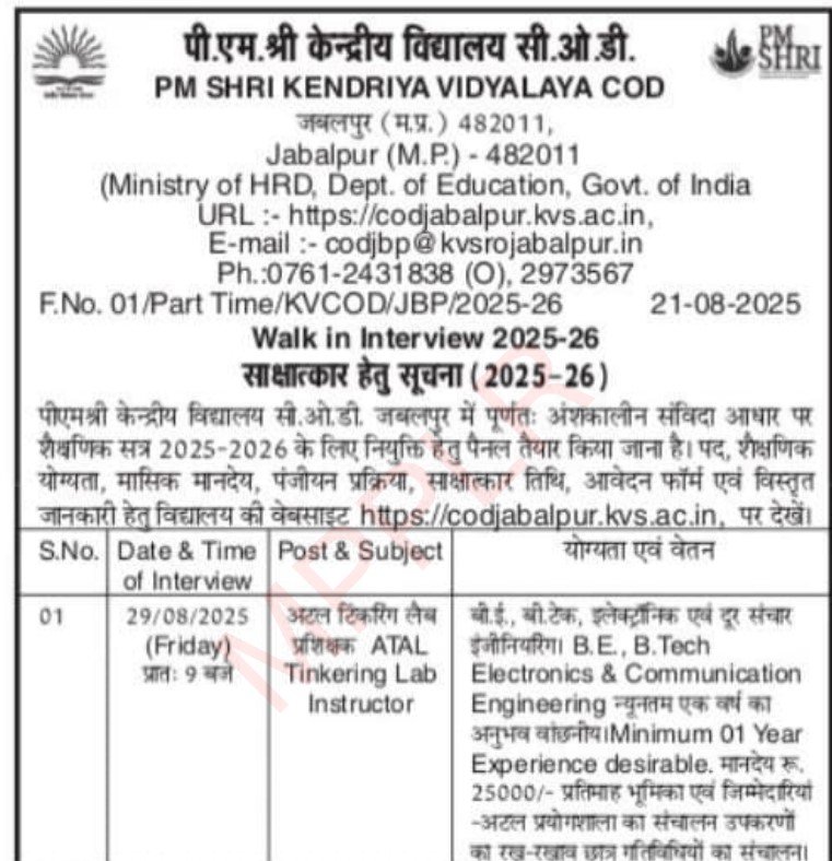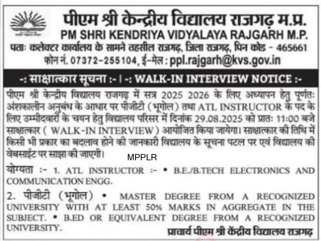 मध्यप्रदेश केन्द्रीय विद्यालय शिक्षक भर्ती से संबंधित विवरण| MP KV School Teacher Vacancy Bharti 2025