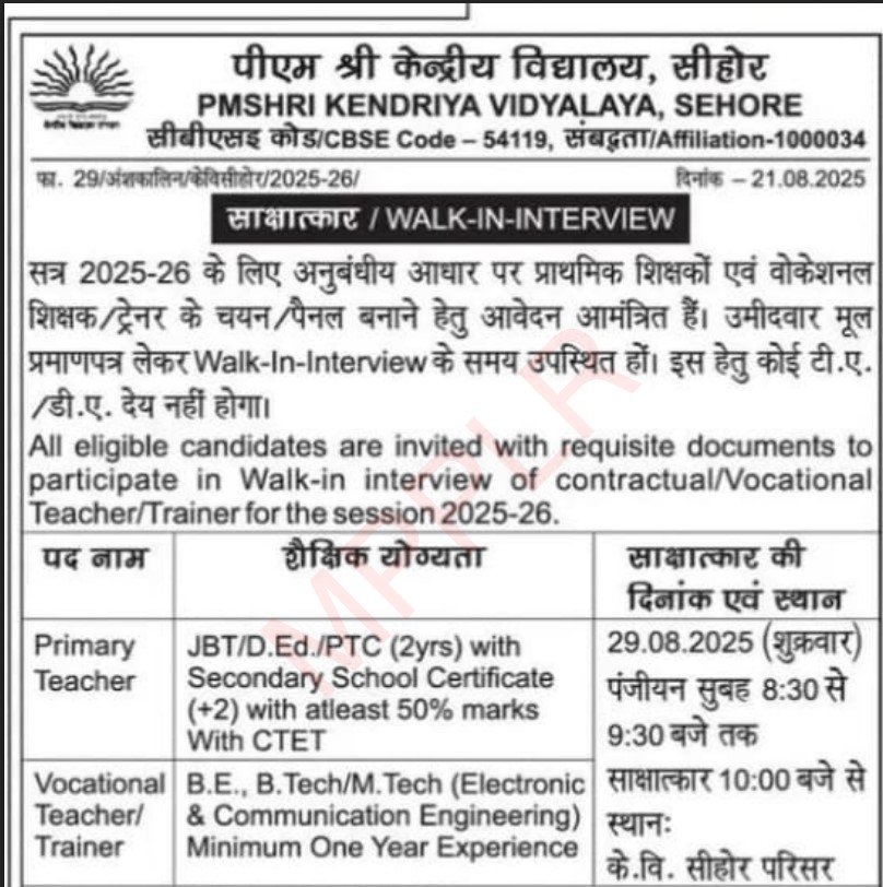 MP KV School Teacher Bharti 2025-मध्यप्रदेश केन्द्रीय विद्यालय शिक्षक भर्ती प्रक्रिया के अंतर्गत विभिन्न पदों के लिए आवेदन आमंत्रित किए गए इन पदों के लिए उम्मीदवारों का चयन साक्षात्कार के आधार पर किया जाएगा भर्ती से संबंधित अधिक जानकारी आगे दी गई है|