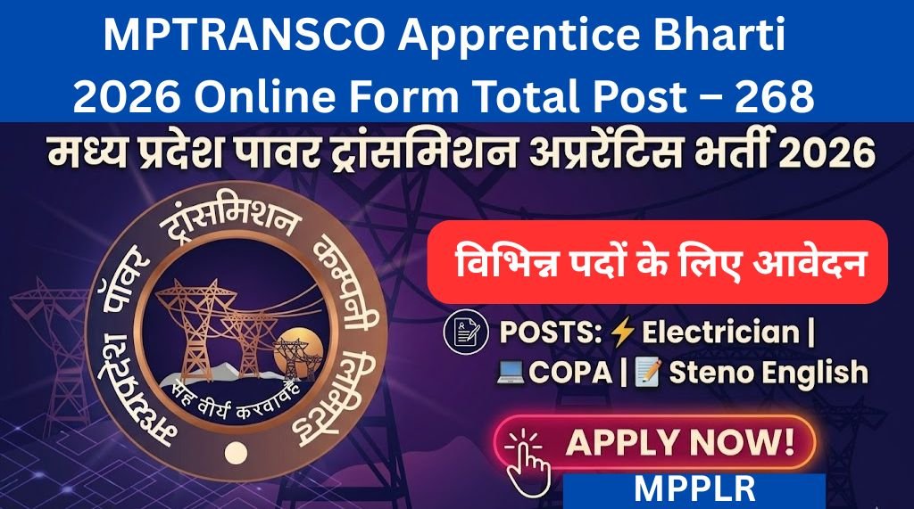 MPTRANSCO Apprentice Bharti 2026-मध्य प्रदेश के युवाओं के लिए सरकारी क्षेत्र में प्रशिक्षण (ट्रेनिंग) प्राप्त करने का एक शानदार अवसर है। म.प्र. पॉवर ट्रांसमिशन कंपनी लिमिटेड (MPTRANSCO), जबलपुर ने अप्रेंटिस एक्ट 1961 के अंतर्गत एक वर्षीय ट्रेड अप्रेंटिस के लिए आधिकारिक अधिसूचना जारी की है । इस भर्ती के जरिए प्रदेश के विभिन्न वृत्त और संभागीय कार्यालयों में कुल 268 पदों पर भर्ती की जाएगी ।